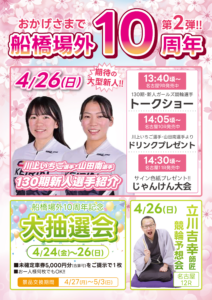 大抽選会当選番号 2026 2/27 イベント情報 船橋場外からのお知らせ ★2026/2/18 鈴木圭一郎選手 最新整備状況 No.162★ ★2026/3/3 鈴木圭一郎選手 最新整備状況 No.163★ 関連記事 4/24(金)~4/26(日) 船橋場外10周年イベント第二弾!! 2026-04-17 5月有料席ポイントデー 2026-04-12 4/11(土) 競輪千葉支部所属・129期新人選手紹介 2026-04-10 4/5(日) 船橋場外10周年イベント(続報) 2026-03-29 4/5(日) 船橋場外10周年イベント 2026-03-26 4月有料席ポイントデー 2026-03-14 3/20(金祝)~3/28(土) 鈴木圭一郎DVD2025プレゼント 2026-03-14 3/21(土) カラダにいいもの大抽選会 2026-03-11