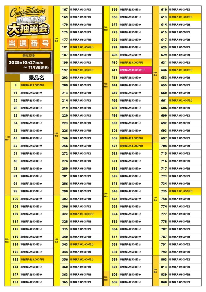 【当選番号】車券購入券大抽選会 2025 10/30 イベント情報 ★10/29 鈴木圭一郎選手 最新整備状況 No.152★ 11/7(金)~ 2026年競輪カレンダープレゼント 関連記事 2/14(土) 浦田信輔選手・岩見貴史選手トークショー 2026-01-30 お年玉抽選会当選番号 2026-01-04 1/18(日) 和田真久留選手トークショー 2026-01-02 鈴木圭一郎選手から年賀状をもらおう 2025-12-27 ★年末4日連続!!お得な車券購入券獲得イベント!! 2025-12-25 クリスマス抽選会当選番号 2025-12-25 12/14(日)佐藤励選手 優勝報告会 2025-12-10 12/13(土)野口裕史選手トークショー 2025-12-10