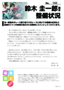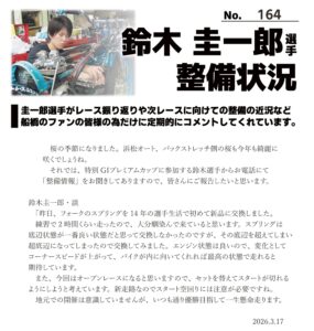★2026/1/1鈴木圭一郎選手 最新整備状況 No.159★ 2026 1/01 鈴木圭一郎選手専用情報 鈴木圭一郎選手から年賀状をもらおう 1/18(日) 和田真久留選手トークショー 関連記事 ★2026/1/13/鈴木圭一郎選手 最新整備状況 No.160★ 2026-01-13 ★12/25鈴木圭一郎選手 最新整備状況 No.158★ 2025-12-27 ★12/16鈴木圭一郎選手 最新整備状況 No.157★ 2025-12-16 ★12/10鈴木圭一郎選手 最新整備状況 No.156★ 2025-12-12 ★11/28鈴木圭一郎選手 最新整備状況 No.155★ 2025-11-28 ★11/20鈴木圭一郎選手 最新整備状況 No.154★ 2025-11-20 ★11/11 鈴木圭一郎選手 最新整備状況 No.153★ 2025-11-12 ★10/29 鈴木圭一郎選手 最新整備状況 No.152★ 2025-10-29