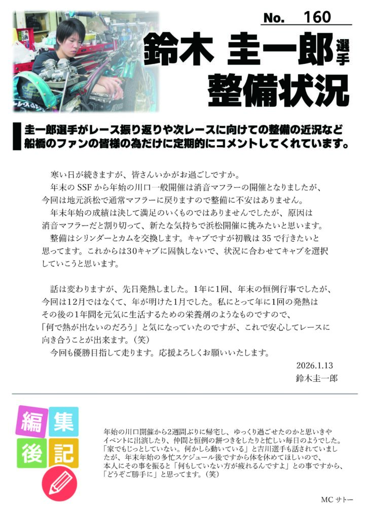 ★2026/1/13/鈴木圭一郎選手 最新整備状況 No.160★ 2026 1/13 鈴木圭一郎選手専用情報 2月有料席ポイントデー 2/14(土) 浦田信輔選手・岩見貴史選手トークショー 関連記事 ★2026/1/1鈴木圭一郎選手 最新整備状況 No.159★ 2026-01-01 ★12/25鈴木圭一郎選手 最新整備状況 No.158★ 2025-12-27 ★12/16鈴木圭一郎選手 最新整備状況 No.157★ 2025-12-16 ★12/10鈴木圭一郎選手 最新整備状況 No.156★ 2025-12-12 ★11/28鈴木圭一郎選手 最新整備状況 No.155★ 2025-11-28 ★11/20鈴木圭一郎選手 最新整備状況 No.154★ 2025-11-20 ★11/11 鈴木圭一郎選手 最新整備状況 No.153★ 2025-11-12 ★10/29 鈴木圭一郎選手 最新整備状況 No.152★ 2025-10-29