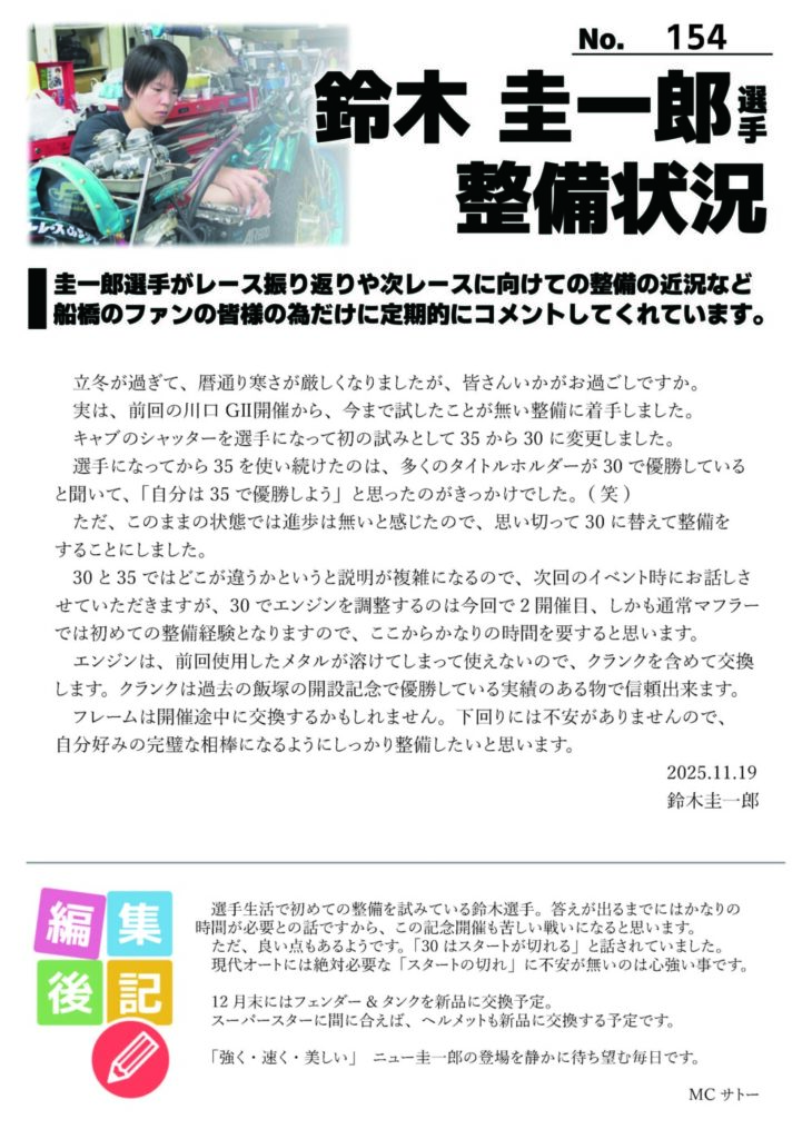 ★11/20鈴木圭一郎選手 最新整備状況 No.154★ 2025 11/20 鈴木圭一郎選手専用情報 ★11/11 鈴木圭一郎選手 最新整備状況 No.153★ 11/30(日) 森且行選手トークショー 関連記事 ★2026/1/13/鈴木圭一郎選手 最新整備状況 No.160★ 2026-01-13 ★2026/1/1鈴木圭一郎選手 最新整備状況 No.159★ 2026-01-01 ★12/25鈴木圭一郎選手 最新整備状況 No.158★ 2025-12-27 ★12/16鈴木圭一郎選手 最新整備状況 No.157★ 2025-12-16 ★12/10鈴木圭一郎選手 最新整備状況 No.156★ 2025-12-12 ★11/28鈴木圭一郎選手 最新整備状況 No.155★ 2025-11-28 ★11/11 鈴木圭一郎選手 最新整備状況 No.153★ 2025-11-12 ★10/29 鈴木圭一郎選手 最新整備状況 No.152★ 2025-10-29