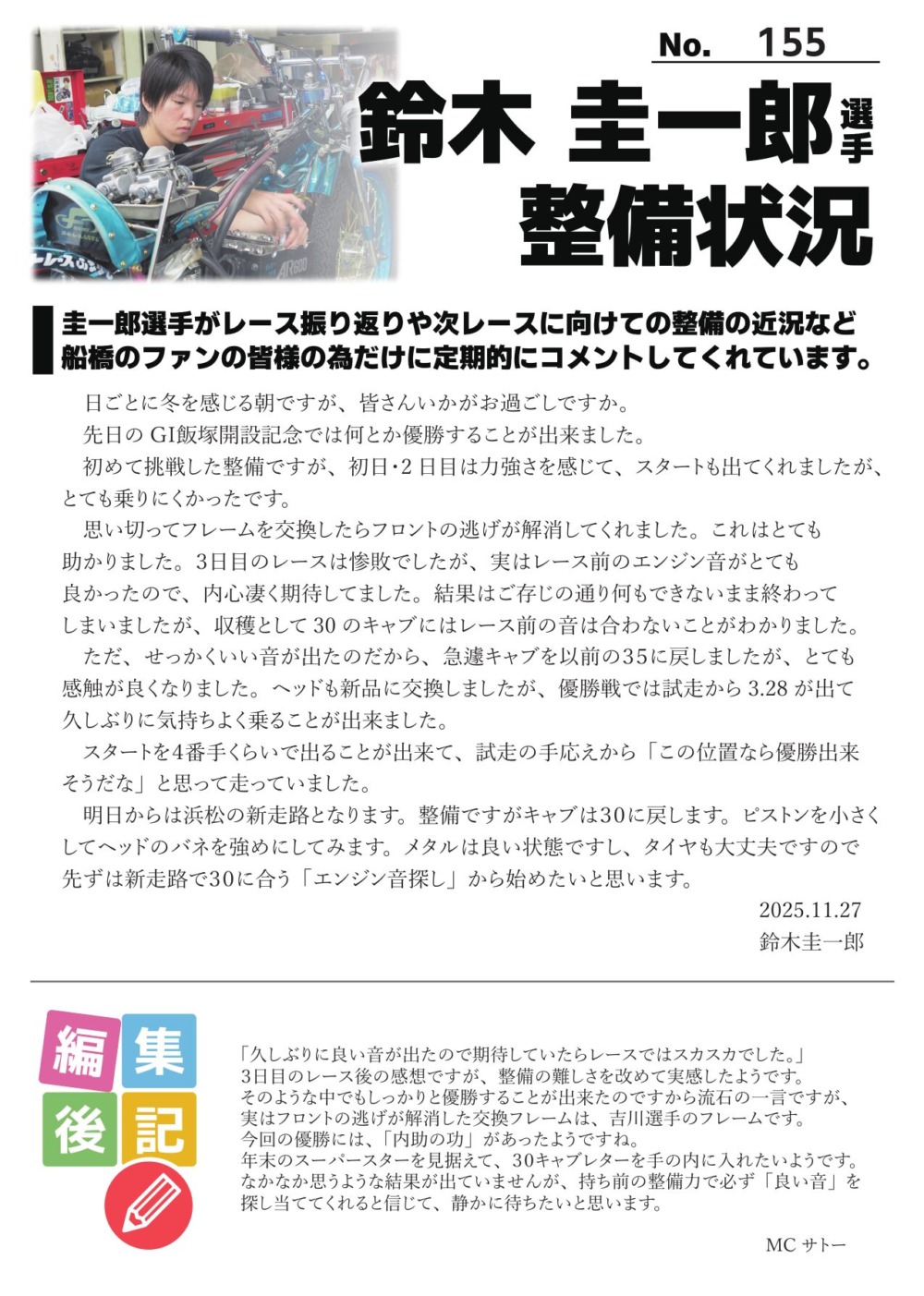 ★11/28鈴木圭一郎選手 最新整備状況 No.155★
