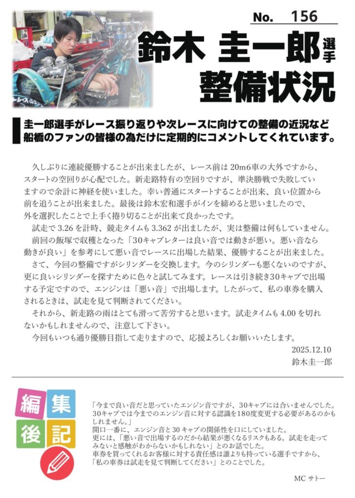 ★12/10鈴木圭一郎選手 最新整備状況 No.156★ 2025 12/12 鈴木圭一郎選手専用情報 12/14(日)佐藤励選手 優勝報告会 ★12/16鈴木圭一郎選手 最新整備状況 No.157★ 関連記事 ★12/16鈴木圭一郎選手 最新整備状況 No.157★ 2025-12-16 ★11/28鈴木圭一郎選手 最新整備状況 No.155★ 2025-11-28 ★11/20鈴木圭一郎選手 最新整備状況 No.154★ 2025-11-20 ★11/11 鈴木圭一郎選手 最新整備状況 No.153★ 2025-11-12 ★10/29 鈴木圭一郎選手 最新整備状況 No.152★ 2025-10-29 ★10/8 鈴木圭一郎選手 最新整備状況 No.151★ 2025-10-08 ★9/18 鈴木圭一郎選手 最新整備状況 No.150★ 2025-09-18 ★9/2 鈴木圭一郎選手 最新整備状況 No.149★ 2025-09-02
