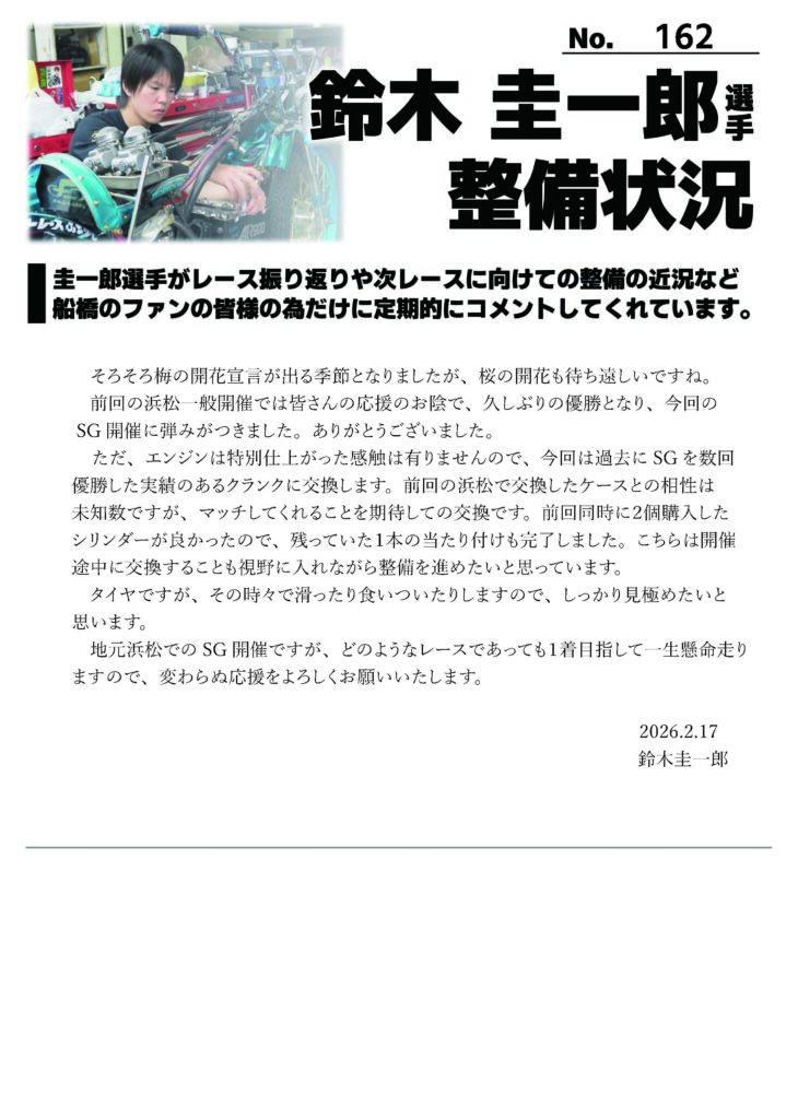 ★2026/2/18 鈴木圭一郎選手 最新整備状況 No.162★ 2026 2/18 鈴木圭一郎選手専用情報 【訂正・お詫び】2/11投稿の記事について 関連記事 【訂正・お詫び】2/11投稿の記事について 2026-02-13 ★2026/1/1鈴木圭一郎選手 最新整備状況 No.159★ 2026-01-01 ★12/25鈴木圭一郎選手 最新整備状況 No.158★ 2025-12-27 ★12/16鈴木圭一郎選手 最新整備状況 No.157★ 2025-12-16 ★12/10鈴木圭一郎選手 最新整備状況 No.156★ 2025-12-12 ★11/28鈴木圭一郎選手 最新整備状況 No.155★ 2025-11-28 ★11/20鈴木圭一郎選手 最新整備状況 No.154★ 2025-11-20 ★11/11 鈴木圭一郎選手 最新整備状況 No.153★ 2025-11-12
