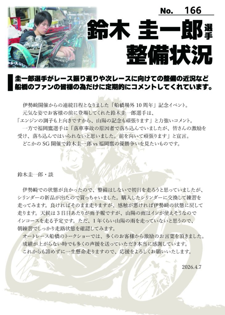 ★2026/4/7 鈴木圭一郎選手 最新整備状況 No.166★ 2026 4/07 鈴木圭一郎選手専用情報 ★2026/4/1 鈴木圭一郎選手 最新整備状況 No.165★ 関連記事 ★2026/4/1 鈴木圭一郎選手 最新整備状況 No.165★ 2026-04-01 ★2026/3/17 鈴木圭一郎選手 最新整備状況 No.164★ 2026-03-17 ★2026/3/3 鈴木圭一郎選手 最新整備状況 No.163★ 2026-03-04 ★2026/2/18 鈴木圭一郎選手 最新整備状況 No.162★ 2026-02-18 【訂正・お詫び】2/11投稿の記事について 2026-02-13 ★2026/1/1鈴木圭一郎選手 最新整備状況 No.159★ 2026-01-01 ★12/25鈴木圭一郎選手 最新整備状況 No.158★ 2025-12-27 ★12/16鈴木圭一郎選手 最新整備状況 No.157★ 2025-12-16