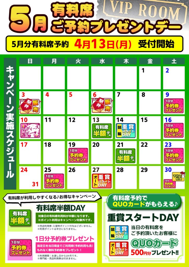 5月有料席ポイントデー 2026 4/12 船橋場外からのお知らせ 4/11(土) 競輪千葉支部所属・129期新人選手紹介 関連記事 4月有料席ポイントデー 2026-03-14 大抽選会当選番号 2026-02-27 【訂正・お詫び】2/11投稿の記事について 2026-02-13 【2/8】オートレース発売内容変更のお知らせ 2026-02-08 お年玉抽選会当選番号 2026-01-04 鈴木圭一郎選手から年賀状をもらおう 2025-12-27 ★年末4日連続!!お得な車券購入券獲得イベント!! 2025-12-25 12月有料席予約及びポイントデーのお知らせ 2025-11-05